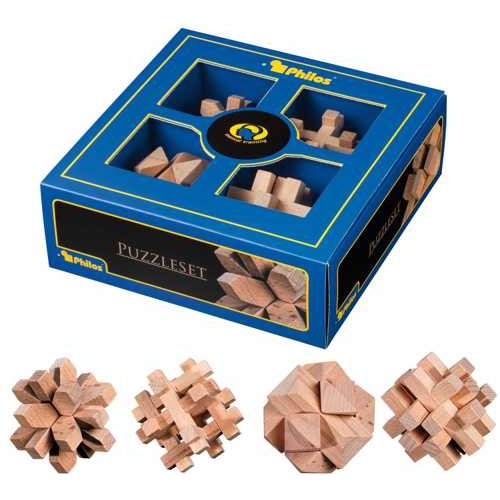 Puzzle-Set, 4 verschiedene Puzzles aus Buchenholz Maße: 21 x 21 x 7.5 cm In einem farbigen Geschenkkarton. Philos