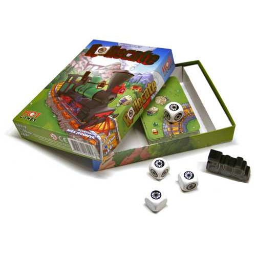 The game consists of 55 playing cards and 4 custom dice and a wooden train figure.