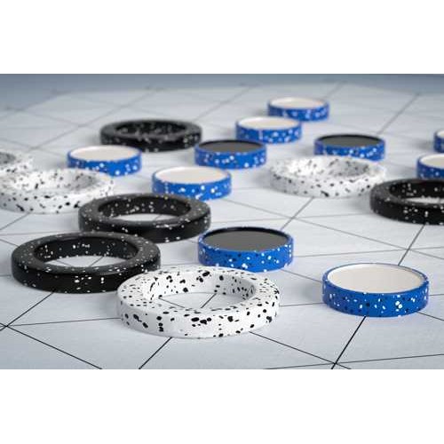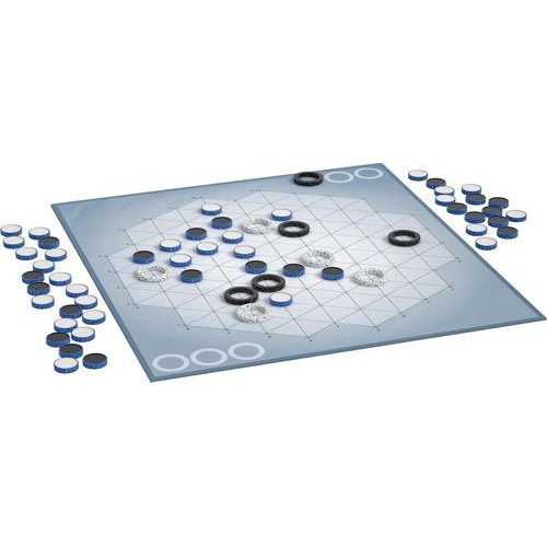 Zwei Spieler platzieren abwechselnd Markieruungssteine und bewegen anschließend einen ihrer Ringe auf den Schnittpunkten