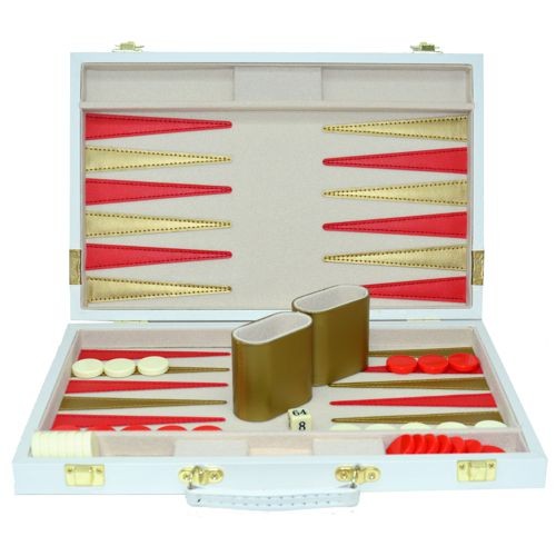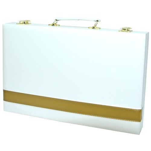 Backgammon-Koffer, weiß mit goldfarbenem Streifen.